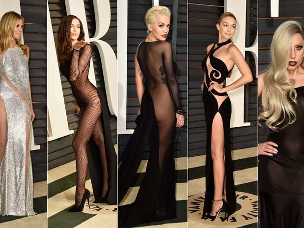 Eram as festas pós-Oscar, mas para algumas celebridades acabou virando uma competição da transparência mais escandalosa. Modelos, atrizes e cantoras elegeram vestidos para lá de ousados para comemorar os resultados da maior premiação do cinema, na noite do último domingo (22), nos Estados Unidos. Siga Terra Estilo no Twitter Depois de dominar os memes com um vestido branco e luvas vermelhas na cerimônia do Oscar, Lady Gaga até parecia ter escolhido um pretinho básico para a balada pós-premiação. Errado! Olhando mais de perto, o vestido era todo transparente e foi usado somente com uma calcinha pequena, deixando os seios aparentes. Sabe aquela dúvida que rondam vestidos transparentes: será que está com ou sem calcinha? Pois é, a cantora Rita Ora respondeu. Ela estava sem calcinha e fez questão de mostrar isso e as curvas ao aparecer na festa da Vanity Fair com vestido preto que cobria quase nada. A modelo russa Irina Shayk também deixou poucas dúvidas sobre a falta de lingerie. A ex-namorada do jogador Cristiano Ronaldo foi à festa usando um vestido com lateral transparente da coleção de alta-costura da Versace. Ela pode, né?! A modelo Heidi Klum elegeu a transparência, mas em recortes estratégicos. O vestido prateado tinha tiras de tule ilusion ao longo do corpo. A atriz Malin Akerman também exibiu a ótima forma ao aparecer com um vestido preto transparente e de decote profundo. O combo transparência e decote também foi o protagonista da produção da modelo Keleigh Sperry, namorada do ator Miles Teller, protagonista do filme Whiplash. A modelo Gigi Hadid, que foi acompanhar o cantor Cody Simpson, também usou vestido longo preto de recortes transparentes estratégicos. Para arrematar, a peça tinha fenda vertiginosa. A atriz Lily Collins pareceu comportada ao lado das colegas, mas também se jogou na transparência para ir a festa pós-Oscar.